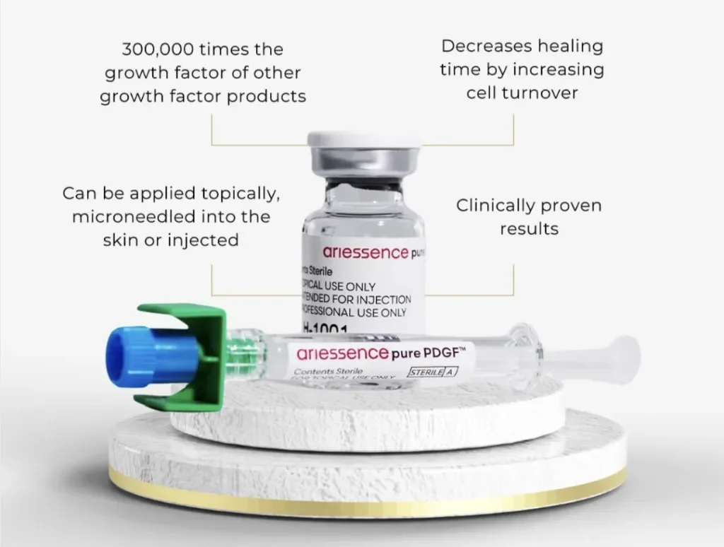 Ariessence Pure PDGF+ is a high-potency, sterile topical serum containing recombinant Platelet-Derived Growth Factor (PDGF) and Hyaluronic Acid, designed for skin rejuvenation and post-procedure recovery by stimulating the body's natural repair processes, promoting collagen, elastin and cell turnover, offering a consistent, lab-derived alternative to PRP (Platelet-Rich Plasma) for enhanced results after treatments like microneedling or lasers, improving texture, firmness and radiance with minimal downtime.
